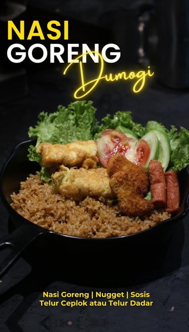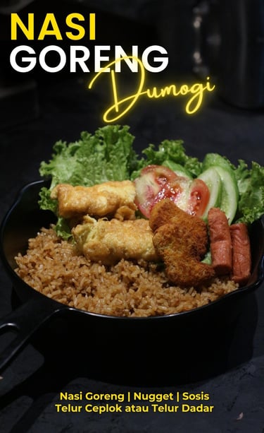 Nikmatnya sajian ciri khas Indonesia, nasi goreng dengan bumbu Dumogi. Nasi goreng lengkap dengan topping sosis, nugget dan telur.